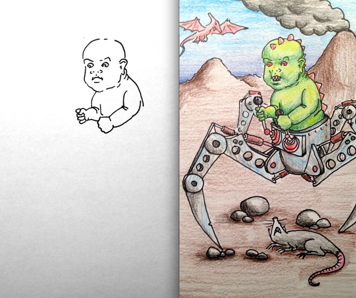 Ce guide rigolo m’a été présenté par mon colocataire qui l’a soutenu sur Kickstarter. Il s’agit d’un cahier de dessin pré-rempli pour laisser travailler l’imagination à partir d’une base déjà esquissée. L’auteur est un enseignant d’arts plastiques qui s’est rendu compte que ses élèves laissé à eux-même face à une page blanche pouvaient rester une demi-heure sans savoir quoi dessiner, alors que devant un dessin partiellement commencé, les idées venaient spontanément. Il s’est donc lancé dans la création d’un livre regroupant une centaine de dessins et de techniques graphiques pour aider les gens à dessiner plus souvent et plus facilement.