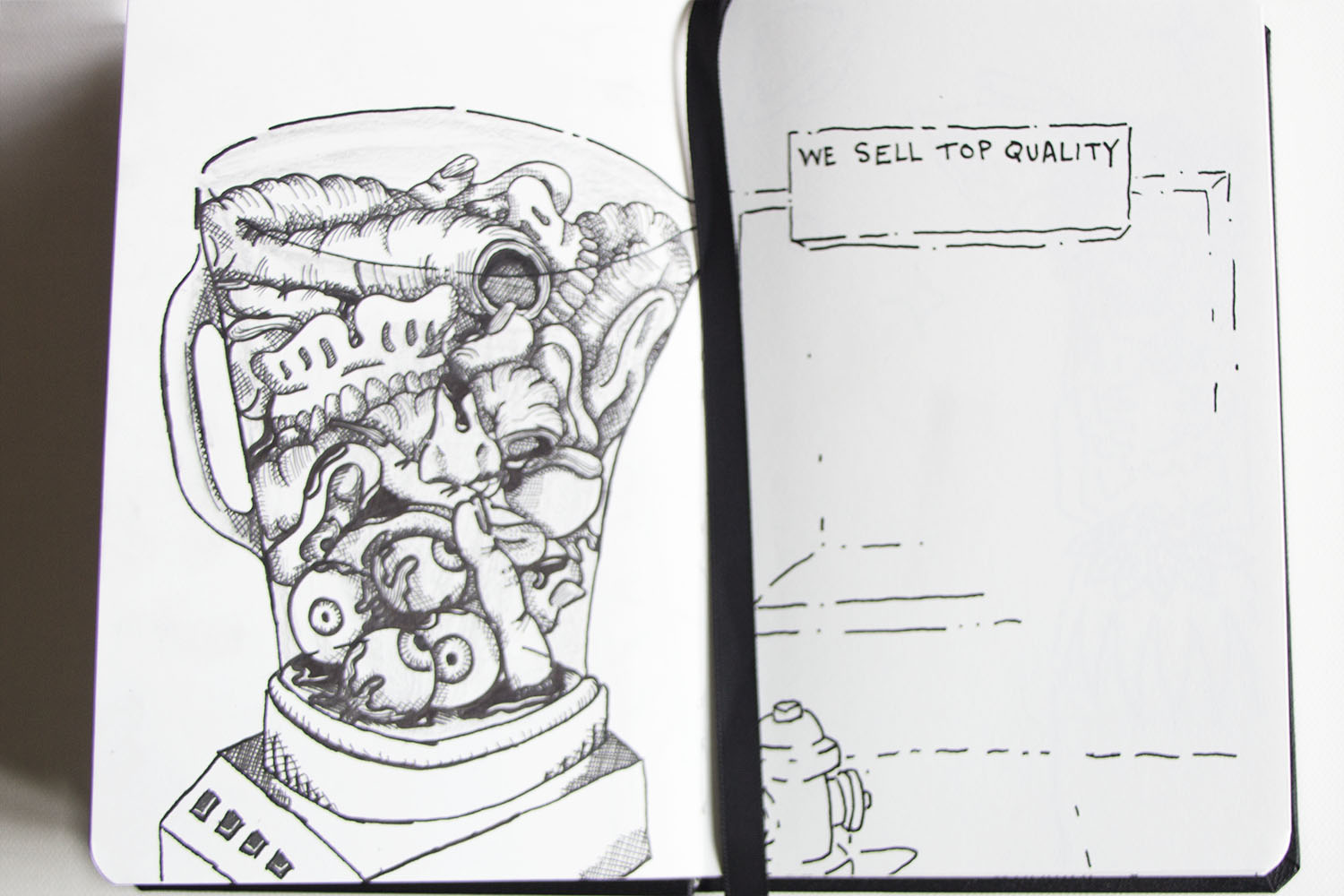 Autant vous dire qu’il a reçu plus que le soutien nécessaire pour mener à bien son projet et que le résultat final est très élégant. Un livre avec une couverture imitation cuir, un papier épais de qualité et beaucoup de futurs dessins amusants, voilà un objet qui est non seulement joli mais aussi très ludique. Des morceaux de visage, des vitrines de magasins, des fenêtres ouvertes ou encore des équilibristes sur un fil, les sujets ne manquent pas sans pour autant imposer un univers. Le dessinateur est libre de terminer le dessin comme il le souhaite, de façon logique ou non, en suivant ce qui est proposé ou pas.