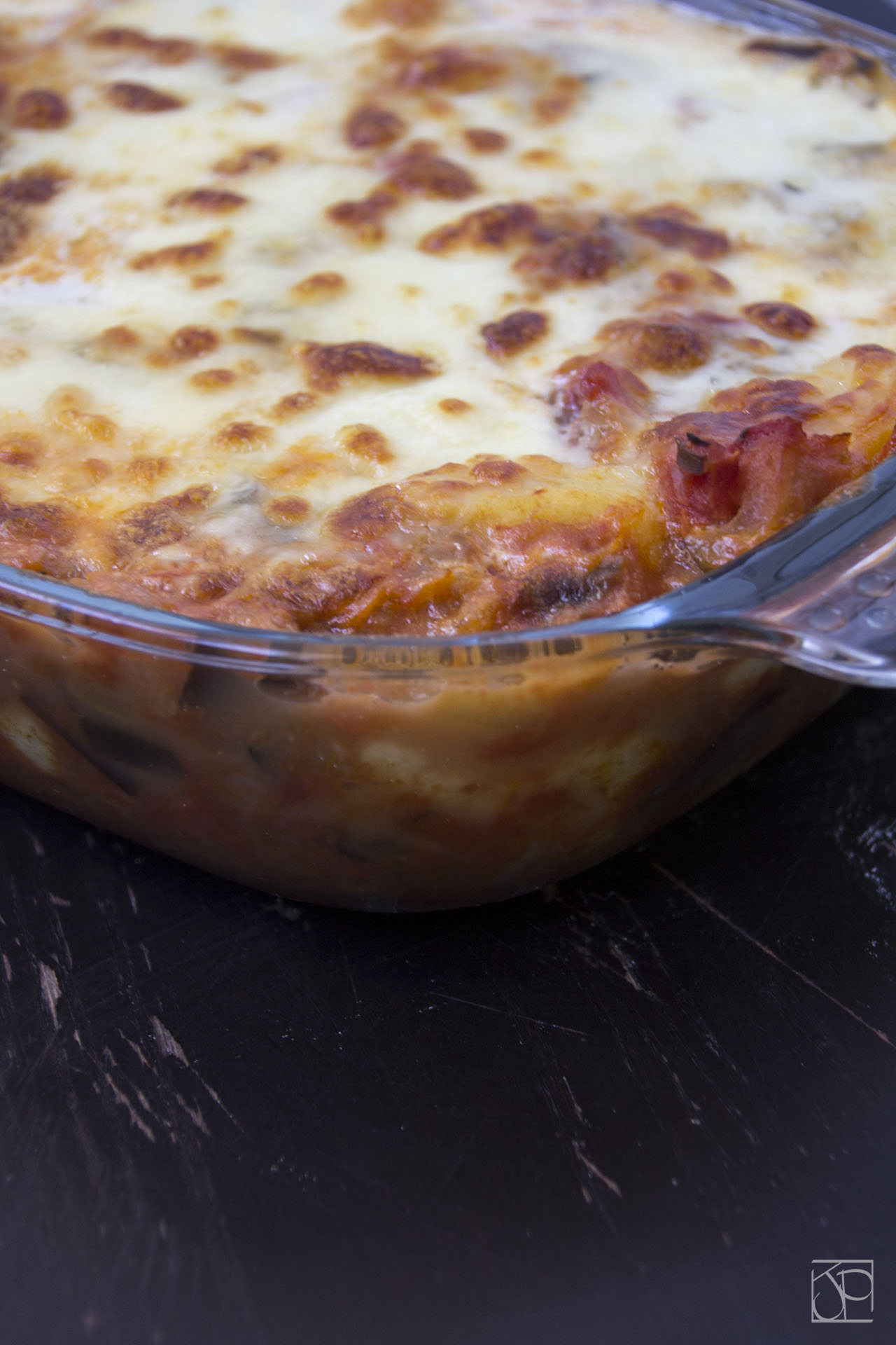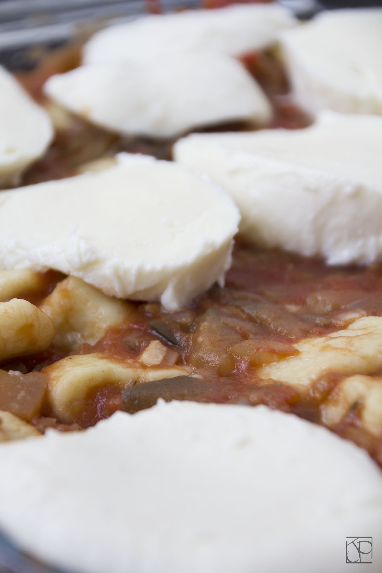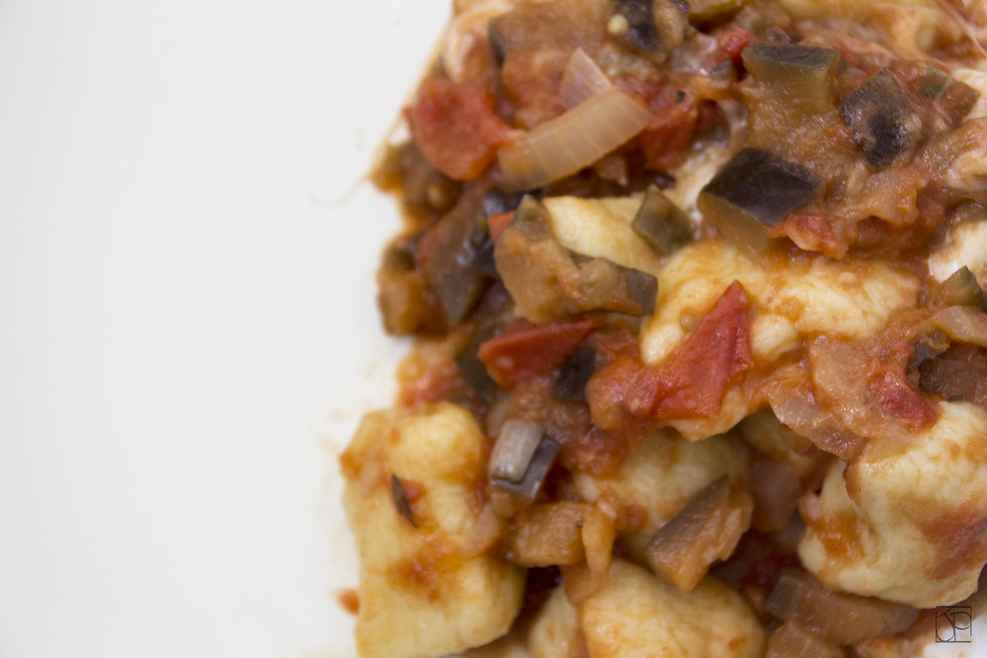 Gratin de gnocchis à la sauce tomate-aubergine et mozzarella.